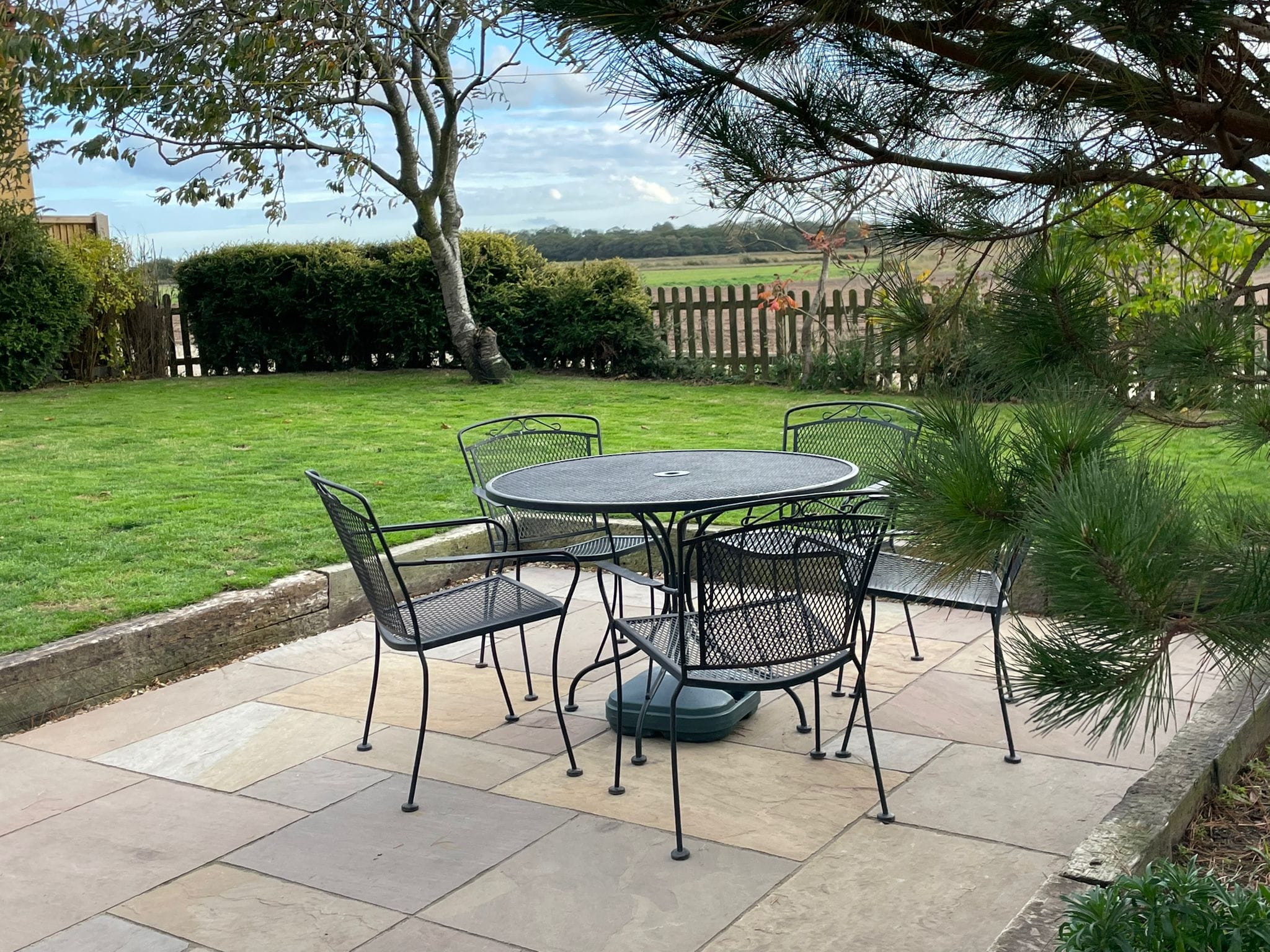 The medium-sized garden is laid mainly to grass with borders and shrubs. There is a patio table and chairs, with parasol and cushions. The palisade fence encloses the property completely, however, please be aware that it is just 3 to 3.5 feet high. This gives uninterrupted views across the fields. Being at the very end of the lane, there is no passing traffic, however, for anyone with a reactive dog, please be aware that the driveway to Mimi cottage next door goes around the perimeter of the garden, and so there is the occasional person or car coming or going.