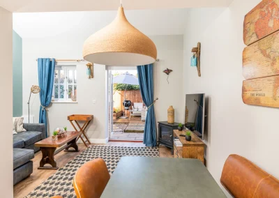 Living & Dining This is a beautiful open-plan space. The dining area features a stylish zinc-topped table and leather seating, while the lounge is all about the large chaise-end leather sofa. There is a 50-inch Smart TV on an adjustable bracket so you can watch it from the dinner table or the sofa! For that extra cosy feel, we have the Dimplex Sunningdale stove—it’s electric but sounds like a real crackling fire.