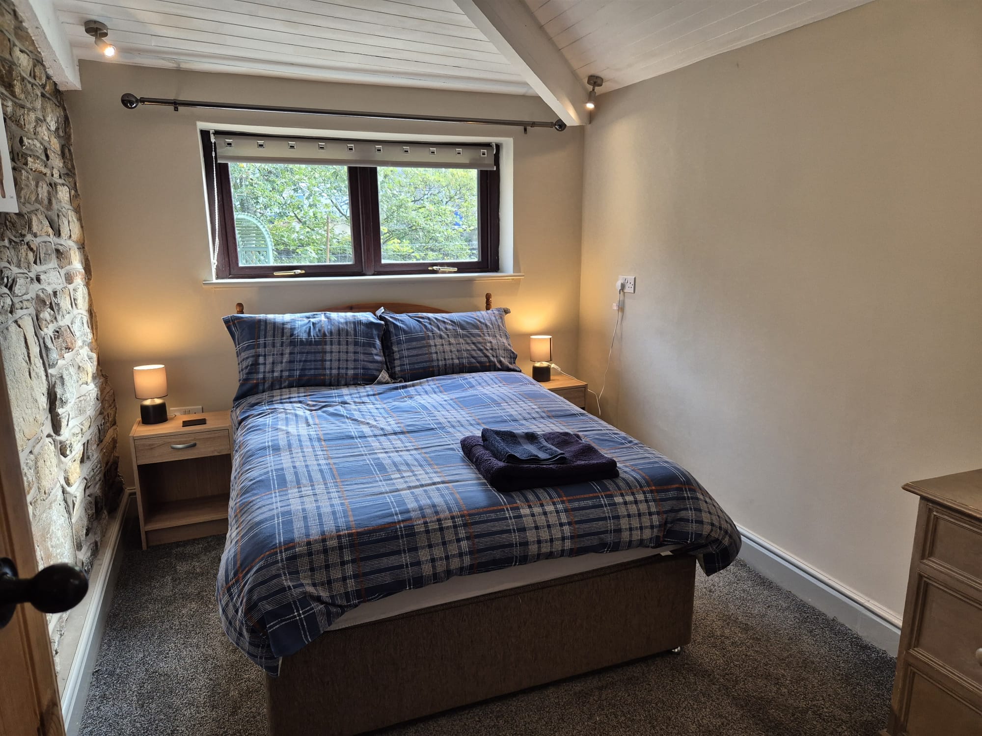 This charming bedroom includes a double bed with views over the rear garden. A feature wall enhances the rustic feel, while bedside tables with lamps and a chest of drawers complete the space. Importantly, this room suits guests whose dogs prefer not to use stairs, making it especially dog-friendly.
