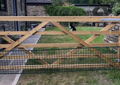 Dry stone walling with added stock fencing above to a height of 5ft facing small Beck, a 5 bar gate leading to side of cottage.